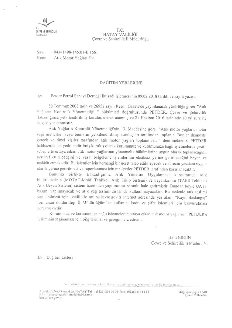 Atık motor yağları konulu Hatay Valiliği’den gelen 20.03.2018 tarih ve 99 sayılı yazı ilişik bulunmaktadır.