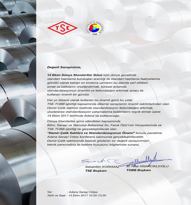 Ülkemiz sanayisinin önemli sektörlerinden olan Demir-Çelik sektörü özelinde standardizasyon farkındalığını artırmak, uluslararası standardizasyon çalışmalarına katılımlarını teşvik etmek üzere kutlanacak Dünya Standartlar günü etkinlikleri kapsamında “Demir-Çelik Sektörü ve Standardizasyonun Önemi” konulu panel düzenlenecektir.