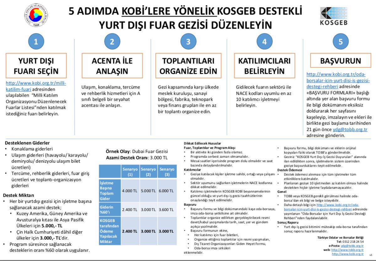 KOSGEB İşletme Geliştirme Destek Programı Yurt Dışı İş Gezisi Destekleri çerçevesinde KOBİ’lerimiz; oda-borsaları kanalı ile sektörel ve en az 10 KOBİ’nin katılımı ile yurtdışına gerçekleştirecekleri iş gezilerinde destek almaya hak kazanmaktadırlar.