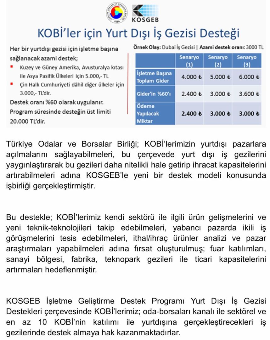 Türkiye Odalar ve Borsalar Birliği; KOBİ’lerimizin yurtdışı pazarlara açılmalarını sağlayabilmeleri, bu çerçevede yurt dışı iş gezilerini yaygınlaştırarak bu gezileri daha nitelikli hale getirip ihracat kapasitelerini artırabilmeleri adına KOSGEB’le yeni bir destek modeli konusunda işbirliği gerçekleştirmiştir.