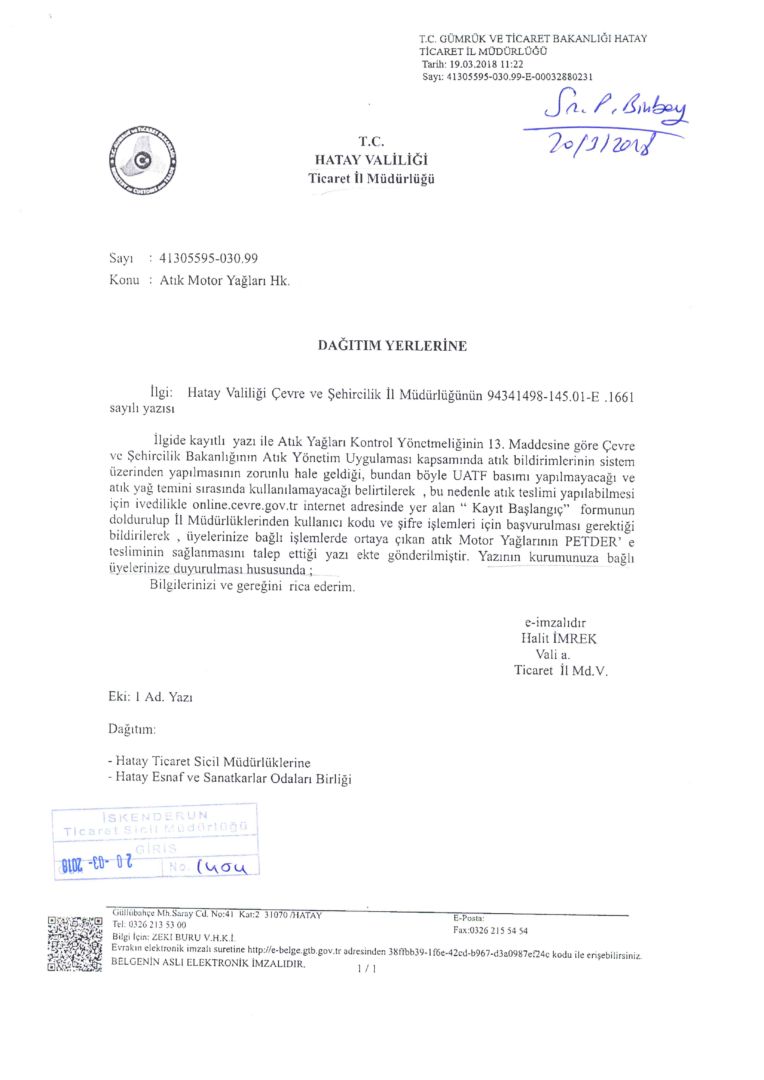 Atık motor yağları konulu Hatay Valiliği’den gelen 20.03.2018 tarih ve 99 sayılı yazı ilişik bulunmaktadır. İlgili firmalarımızın bilgisine rica olunur. Saygılarımla Levent Hakkı YILMAZ Yönetim K...