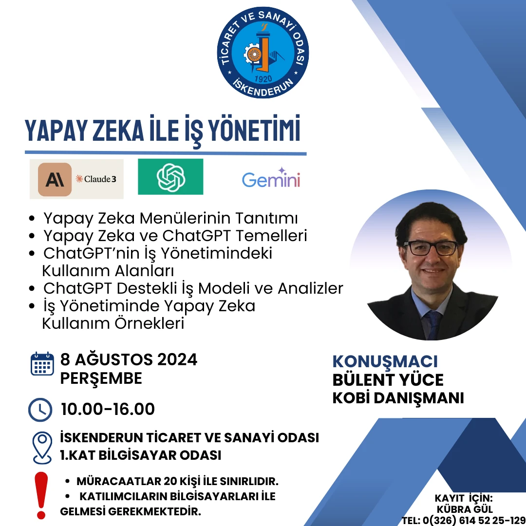 Dear Member,You can use the innovations and conveniences brought by Artificial Intelligence programs in your business A training titled "Business Management with Artificial Intelligence" will be organ...