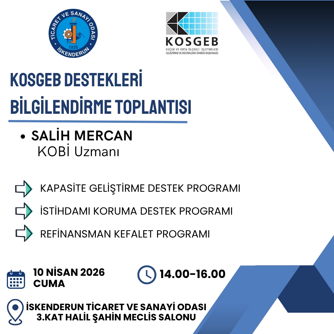 Değerli Üyelerimiz,Odamız ve KOSGEB Hatay İl Müdürlüğü iş birliğinde, KOSGEB Uzmanı Sayın Salih Mercan’ın sunumlarıyla Güncel KOSGEB Desteklerine ilişkin bilgilendirme toplantısı 10 Nisan 2026 Cuma gü...