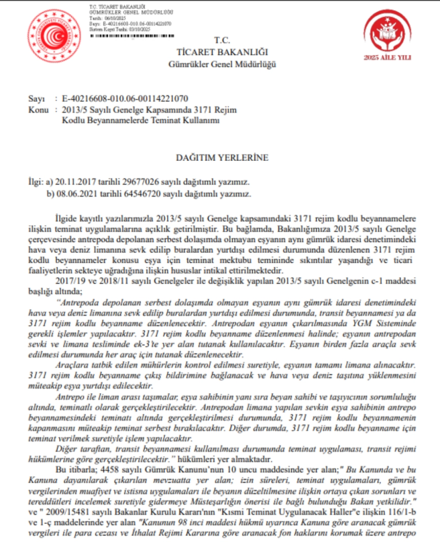 Odamız girişimleri ile ilgili yetkili birimlere iletilen "Ticaret Bakanlığı Gümrükler Genel Müdürlüğü’nün 2013/5 sayılı Genelgesi kapsamında, antrepoda depolanan serbest dolaşımda olmayan eşyanın, aynı gümrük idaresi denetimindeki hava veya deniz limanına sevk edilerek yurt dışı edilmesi durumunda düzenlenen 3171 rejim kodlu beyannamelere ilişkin teminat uygulamaları dolayısıyla üyelerimizin yaşadığı zorluklar” konusunda 02.10.2025 tarihinde Bakanlık Makamının Olur’u ile düzenleme yapılmıştır.