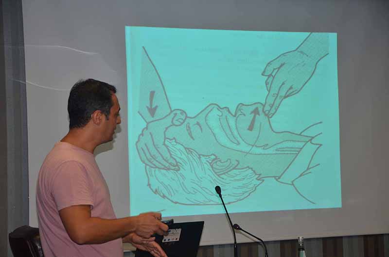 İTSO Personellerine yönelik verilen İlk yardım eğitiminde kalp krizi ve şuur kaybı yaşayan hastalara yönelik yapılması gereken kalp masajı ve suni teneffüs hakkında da detaylı ve görsel meteryaller kullanılarak bilgiler veren İlk ve Acil Yardım Uzmanı İş yeri Hekimi Uzm.Dr. Aydın Deniz Karataş, “Özellikle bilinç kaybı olanlarda dil geri kaçarak solunum yolunu tıkayabilir. Hastanın bilinç kaybı belirlenmiş ise ağız içi önce göz ile daha sonra işaret parmağı yandan ağız içine sokularak bir çengel gibi kullanılarak diğer yandan çıkartılmak suretiyle kontrol edilmeli, ardından yabancı cisim varsa bir bez aracılığı ile çıkartılmalıdır. Kalp masajları ve suni teneffüsler ortalama yarım saati bulabilir” dedi.
