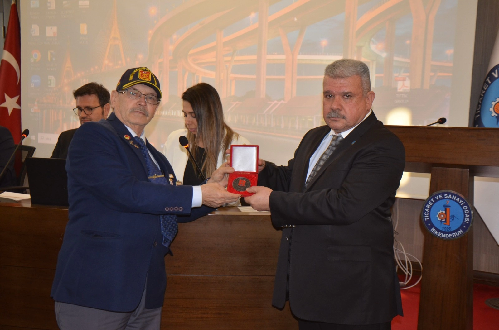 Meclis toplantısı öncesi Türkiye Muharip Gaziler Derneği İskenderun Şube Başkanı Kıbrıs Gazisi Neşet Turhan, derneğin özel olarak yaptırmış olduğu şilti ve flamayı İTSO Muhasip Üye Gassan Kuran’a takdim ederek, derneğe vermiş olduğu desteklerden dolayı İTSO’ya teşekkür etti.
