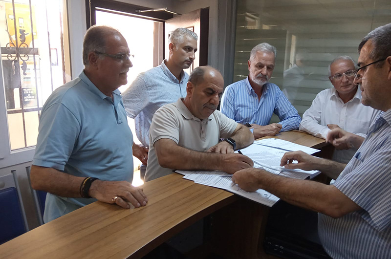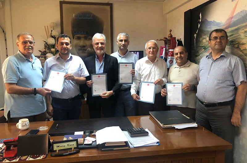 İskenderun Küçük Sanayi Sitesi Yapı Kooperatifi Başkanı İbrahim Açıkgöz ve Yönetim Kurulu Üyeleri Belen Milli Emlak Müdürlüğünden, yeni sanayi sitesi için 16.244.58 m2 arazinin tapusunu aldılar.