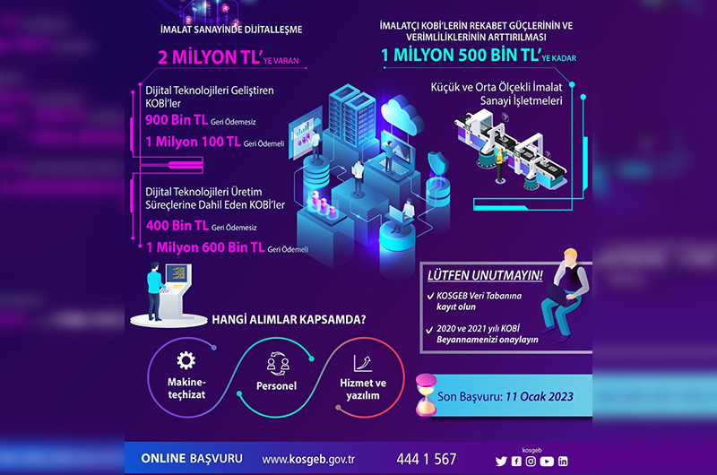 KOSGEB, 2019 yılından bu yana imalatçı KOBİ’lere yönelik olarak çıktığı “İmalat Sanayinde Dijitalleşme” başlıklı çağrıların hem kapsamını genişletti hem de destek üst limitlerini arttırdı Yeni ça...