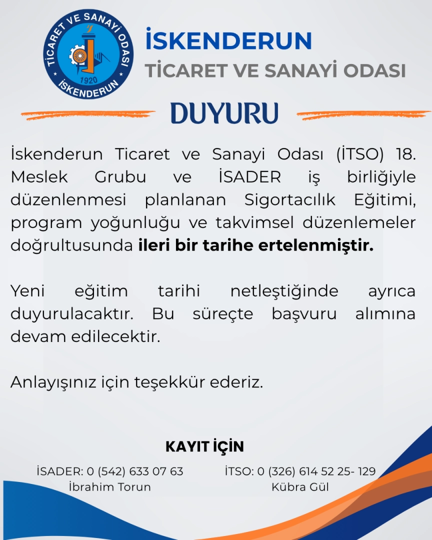 İskenderun Ticaret ve Sanayi Odası (İTSO) 18. Meslek Grubu ve İSADER iş birliğiyle düzenlenmesi planlanan Sigortacılık Eğitimi, program yoğunluğu ve takvimsel düzenlemeler doğrultusunda ileri bir tarihe ertelenmiştir.