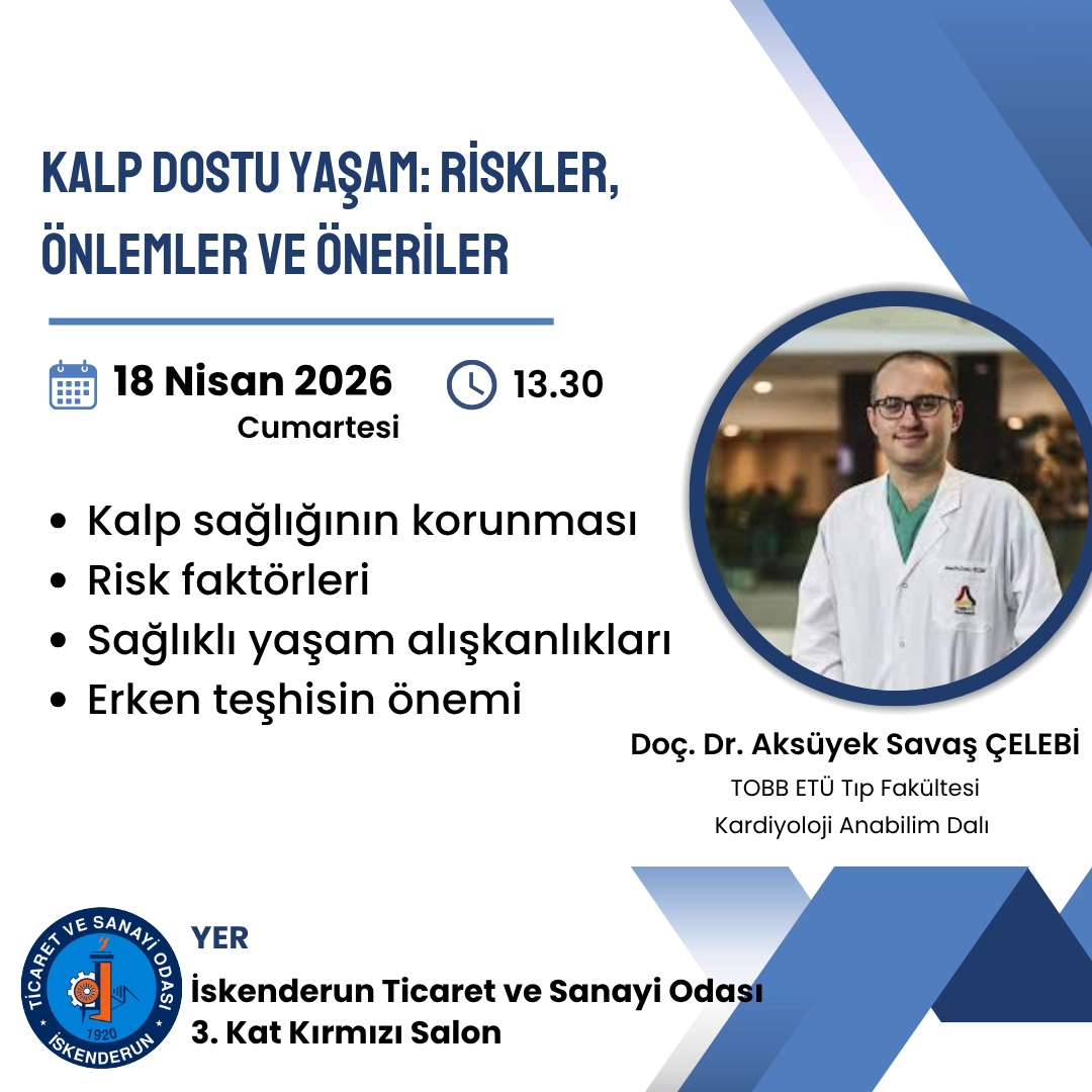İskenderun Ticaret ve Sanayi Odası ev sahipliğinde, TOBB ETÜ Hastanesi Kardiyoloji Anabilim Dalı Doç. Dr. Aksüyek Savaş Çelebi tarafından kalp sağlığının korunması, risk faktörleri ve alınması gerek...