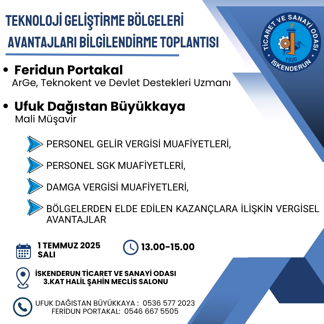 Teknoloji Geliştirme Bölgeleri Avantajları Bilgilendirme Toplantısı, 1 Temmuz Salı günü odamız 3. Kat Halil Şahin Meclis Salonunda Yapılacaktır. Toplantıda; Personel gelir vergisi muafiyetleri, pers...