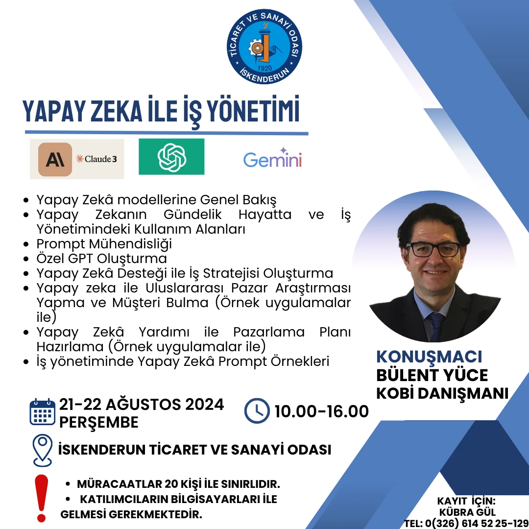 Değerli Üyemiz,Yapay Zeka programlarının getirdiği yenilikleri ve kolaylıkları işletmenizde uygulayabilmek, yeni nesil yapay zeka destekli yönetim süreçlerini deneyimlemek ve işletmenize sağlayacağı p...