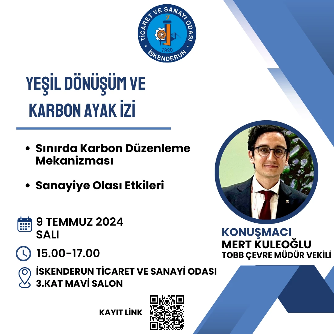 ‘Yeşil Dönüşüm ve Karbon Ayak İzi’ semineri, TOBB Çevre Müdür Vekili Mert KULEOĞLU tarafından İskenderun Ticaret ve Sanayi Odası’nda gerçekleştirilecektir.• Sınırda karbon düzenleme mekanizması ve• Sa...