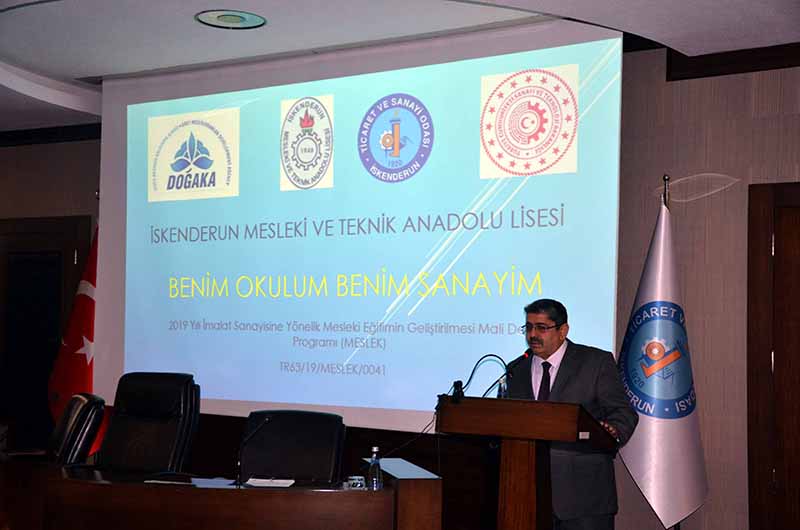 Toplantının açılışında Proje hakkında bilgiler veren Mesleki ve Teknik Anadolu Lisesi Müdürü Yusuf Yıldırım ; “ DOĞAKA 2019 Yılı İmalat Sanayisine Yönelik Mesleki Eğitimin Geliştirilmesi Mali Destek Programı Kapsamında, yürütücüsü olduğumuz “Benim Okulum Benim Sanayim” Projesi, İskenderun Ticaret ve Sanayi Odası ortaklığında yürürlüğe girmiştir. Tümay Makina, Kahraman Sarsılmaz Makina ve Yıldırım Ahşap firmaları projemizin iştirakçileridir. Projede kapsamında, İskenderun Mesleki ve Teknik Anadolu Lisesine CNC Torna Simülasyon, Pnömatik – Elektropnömatik, Otomatik Kumanda, CNC Plazma Kesim, Kaynak Simülasyon ve 3D Akıllı Yazıcı laboratuvarları kurulacaktır. Laboratuvarlarda İTSO ve iştirakçiler bünyesinde çalışanlara teknolojik gelişmelere paralel Otomasyon, CNC Kodlama, 3D üretim, Plazma Kesim, makina bakım onarım eğitimleri verilecektir. İskenderun Mesleki ve Teknik Anadolu Lisesi öğrencileri de bu eğitimleri alarak bölgenin kalifiye eleman ihtiyacını karşılamada önemli rol üstleneceklerdir” dedi.