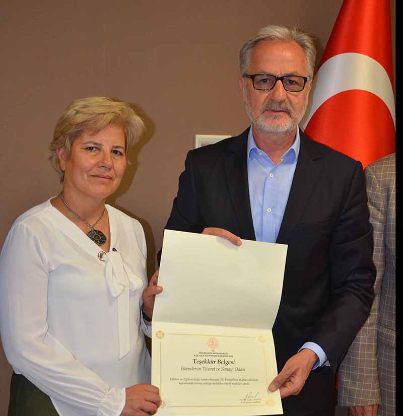 İskenderun Halk Kütüphanesi müdürü Harika Leyla Yaman, Kültür ve Eğitime değer katan İTSO’ya desteklerinden dolayı Teşekkür Belgesini Yönetim Kurulu Başkanı Levent Hakkı Yılmaz’a takdim etti.