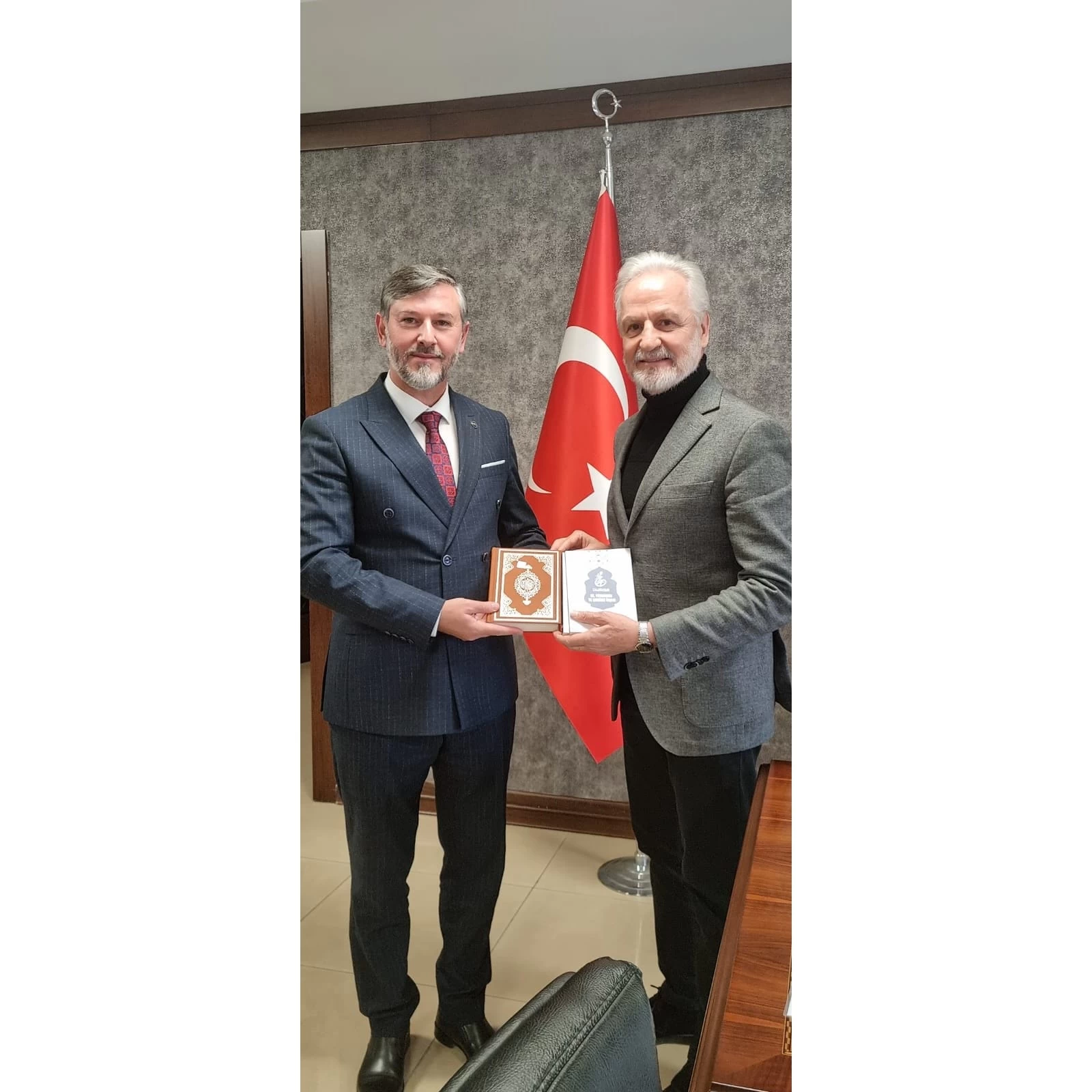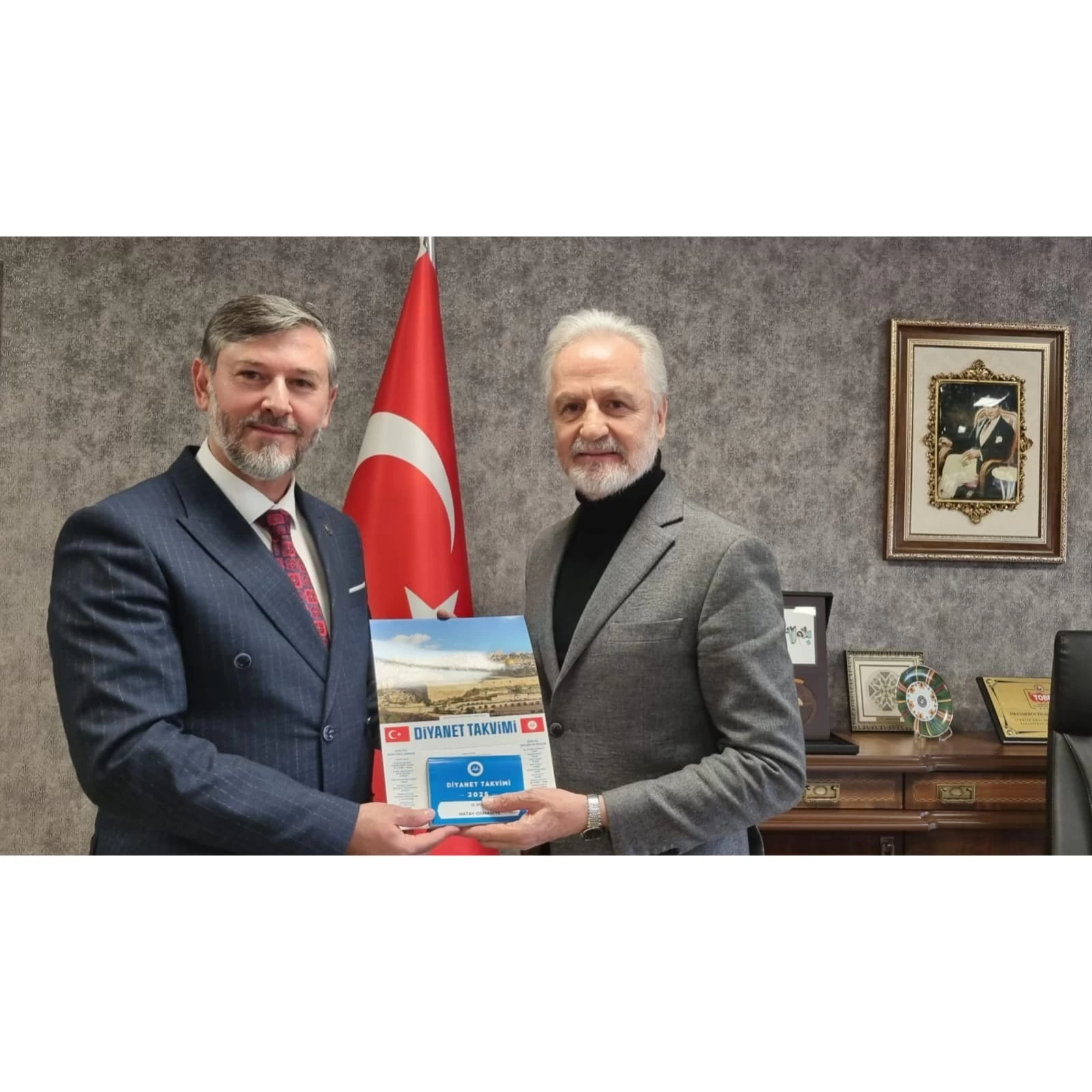 Hatay İl Müftüsü Mevlüt Topçu, İskenderun Ticaret ve Sanayi Odası Başkanı Levent Hakkı Yılmaz’ı ziyaret etti. Depremde zarar gören ibadethaneler ve yapım-onarım süreçleri üzerine fikir alışverişinde bulunulan ziyaret sonrası, günün anısına Kur"an-ı Kerim ve Diyanetin 2025 yılı yapraklı takvimini hediye eden İl Müftüsü Mevlüt Topçu’ya nezaketlerinden dolayı teşekkürlerimizi sunuyoruz.
