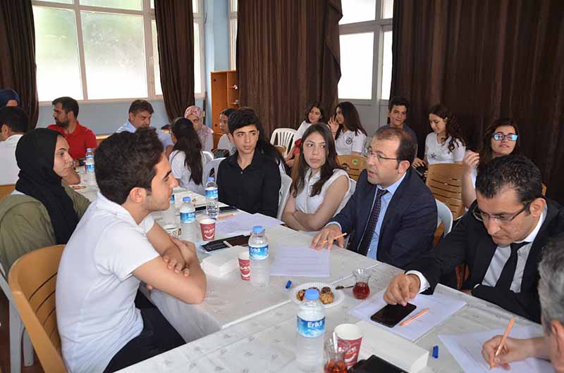 Çalıştay’ın son bölümünde ise, Öğrenciler ve Çalıştaya katılan KOSGEB Hatay İl Müdürü Hayrettin Çevik, İskenderun Teknik Üniversitesi İşletme ve Yönetim Bilimleri Fakültesi Dekanı aynı zamanda TOBB’un Akademik Danışmanlığını da yürüten Prof.Dr.Nazif Çalış, TOBB Hatay Kadın Girişimciler Kurulu Başkanı Yeşim Ugutmen, İş insanları, İskenderun Serbest Muhasebeci Mali Müşavirler Odası Başkanı Merih Hasan Yıldırım ve yönetim kurulu üyeleri, okul müdürleri, projede yer alan öğretmen ve öğrenciler, Okul salonunda oluşturulan masalarda bir araya gelerek karşılıklı fikir alış verişinde bulundular.