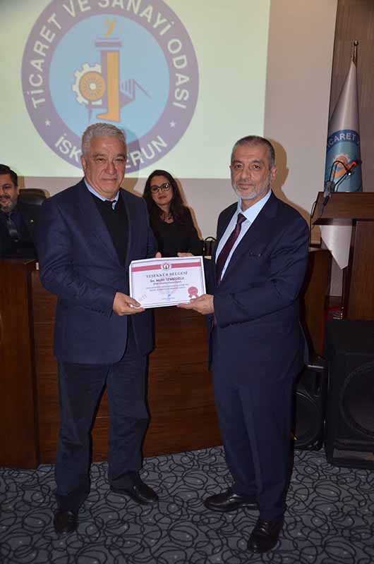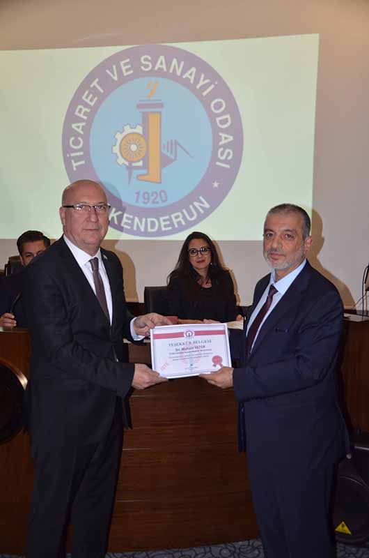 İskenderun Teknik Üniversitesi Rektörü Prof.Dr.Türkay Dereli, konuşmasının ardından Teşekkür belgesini İTSO Başkanı Levent Hakkı Yılmaz, İTSO Başkan yardımcısı Muhsin Yeter VE İTSO yönetim kurulu üyesi Müfit Tennioğlu’na takdim etti. Ardından meclis üyelerine de Teşekkür belgeleri verildi.