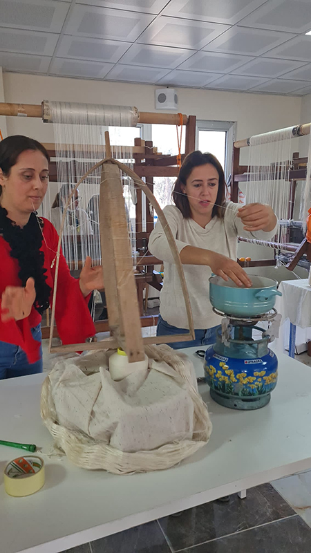 SODES Destek Programı kapsamında Samandağ Belediyesi ve Samandağ Kadın Dayanışma Derneği ortaklığıyla hazırlanan “Kozanın İpeğe Heyecanlı Yolculuğu Projesi” kapsamında tezgahlarda ipek dokumacılığı ve üretimler titizlikle yapılıyor