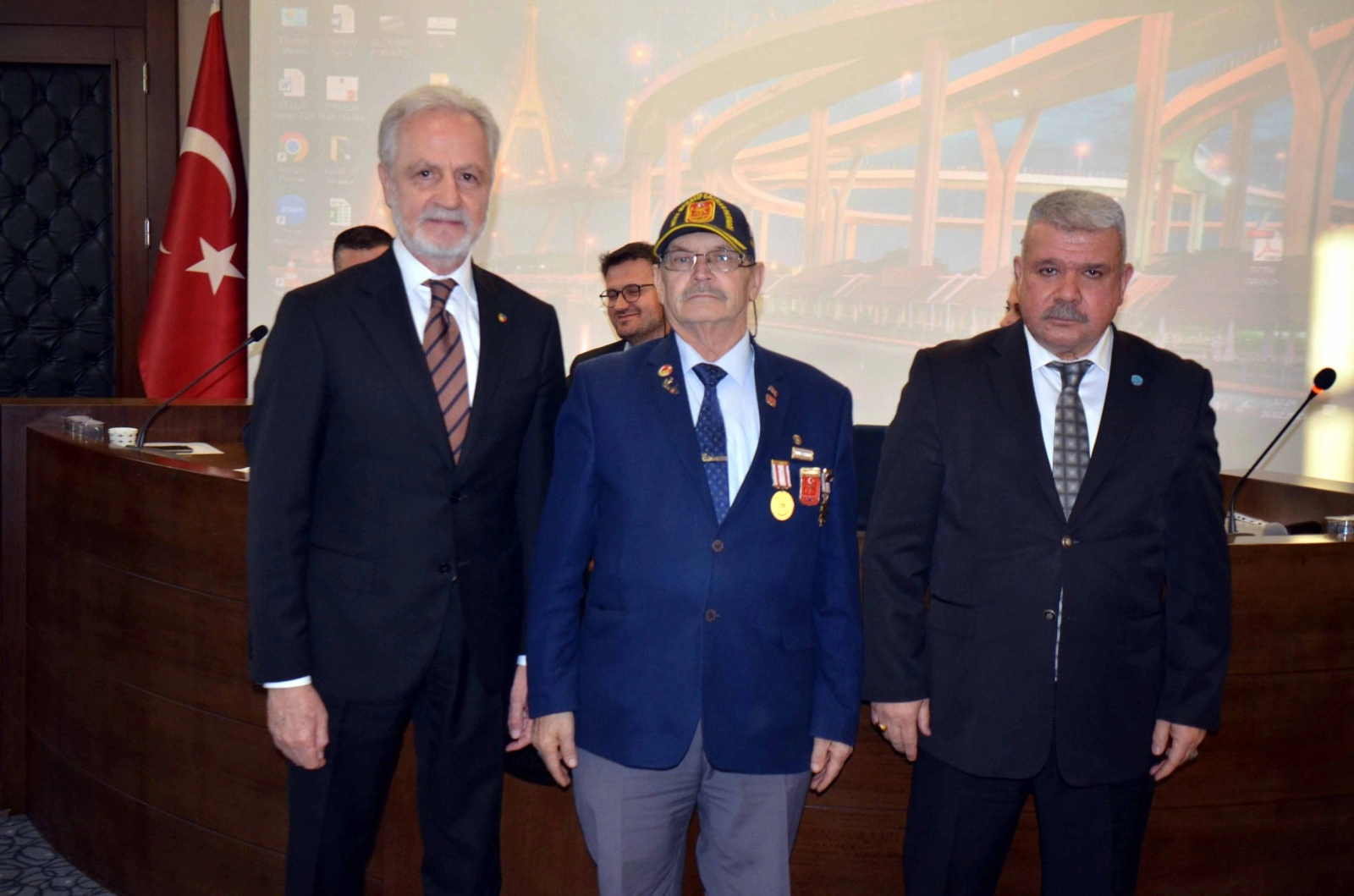 Meclis toplantısı öncesi Türkiye Muharip Gaziler Derneği İskenderun Şube Başkanı Kıbrıs Gazisi Neşet Turhan, derneğin özel olarak yaptırmış olduğu şilti ve flamayı İTSO Muhasip Üye Gassan Kuran’a takdim ederek, derneğe vermiş olduğu desteklerden dolayı İTSO’ya teşekkür etti.