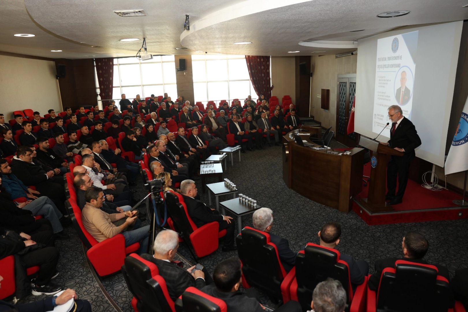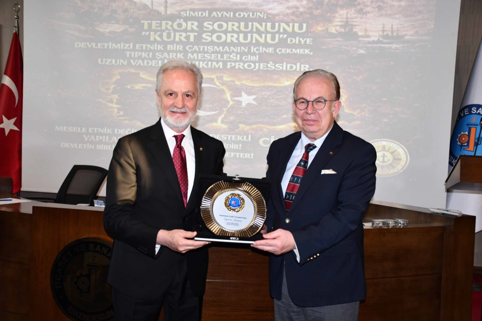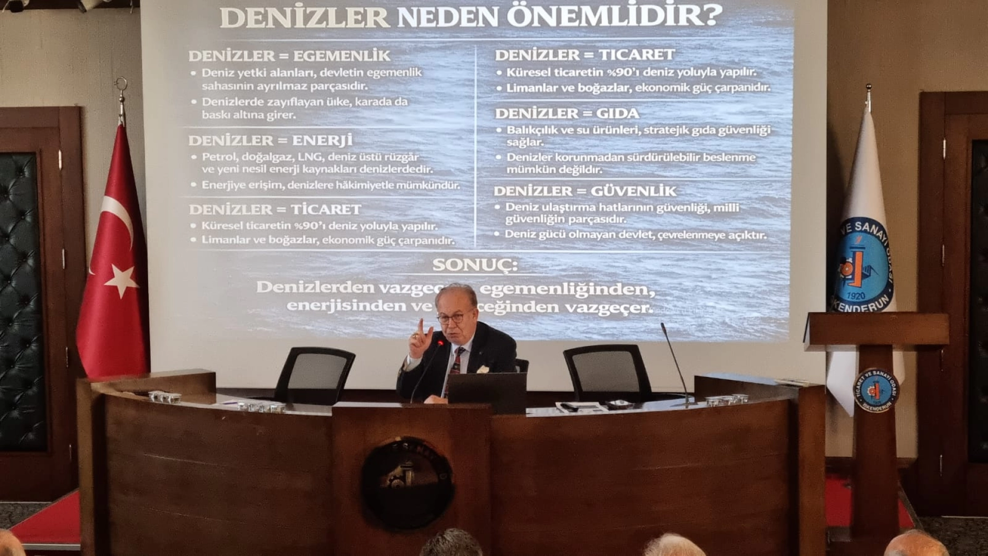 İskenderun Ticaret ve Sanayi Odası toplantı salonunda gerçekleştirilen “Mavi Vatan, Mavi Ekonomi ve Dış Gelişmeler” konulu programda, Müstafi Tümamiral Prof. Dr. Cihat Yaycı bilgi ve deneyimlerini katılımcılarla paylaştı.