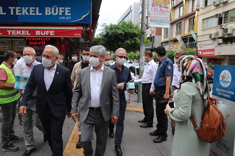 İTSO Başkanı Levent Hakkı Yılmaz ve Başkan Yardımcısı Muhsin Yeter Vali Rahmi Doğan ve Protokol ile birlikte maske denetimine katıldılar