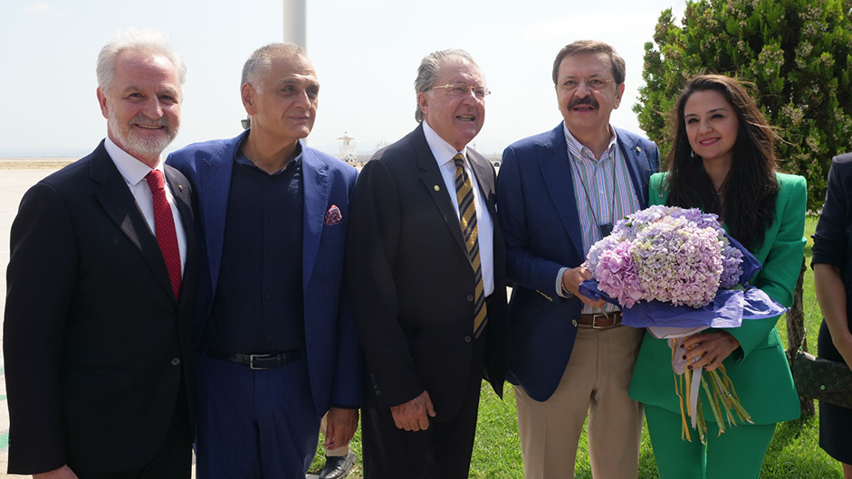 TOBB Başkanı Rifat Hisarcıklıoğlu’nu Hatay Havaalanıda İTSO Başkan Levent Hakkı Yılmaz ve Genel Sekreter Figen Gül Dönmez çiçekle karşıladı.
