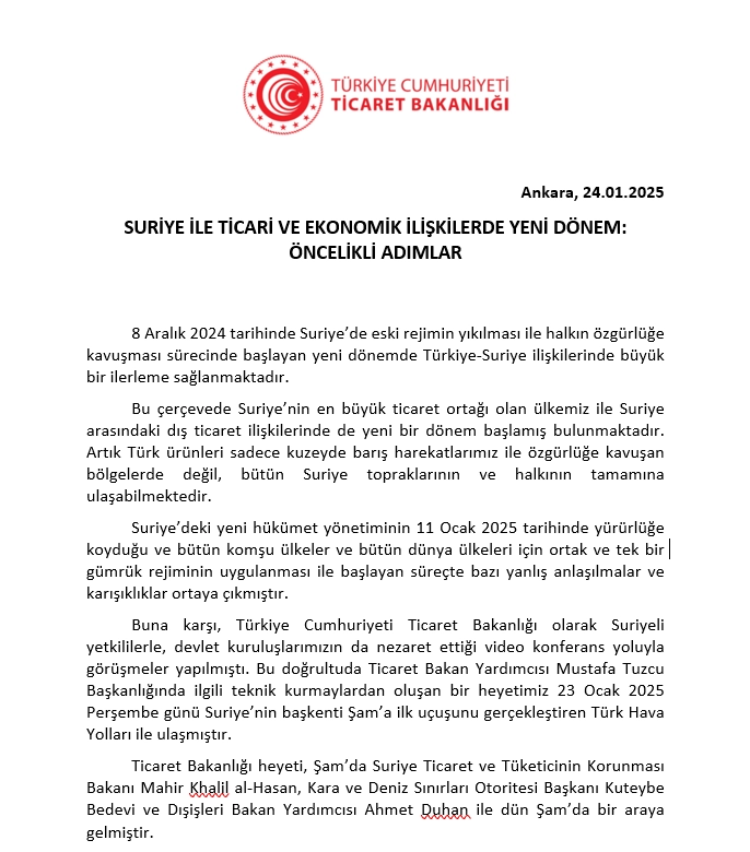 Firmalarımızın, değişen Suriye rejimi karşısında ticari faaliyetlerine etkin şekilde devam edebilmesi ve ülke ekonomisine katkılarının gözetilmesi konusunda Ticaret Bakanlığımız iletilen talepleri dik...