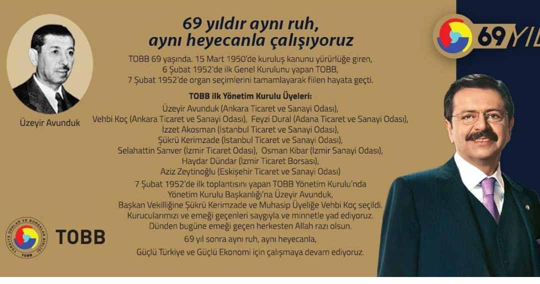 TOBB. 69 yaşında. Kurucularımızı ve emeği geçenleri saygı ve minnetle yad ediyoruz. Dünden bugüne başta sayın Başkanım Rifat Hisarcıklıoğlu’na ve katkı veren herkese teşekkürlerimi sunarım .69 yı...